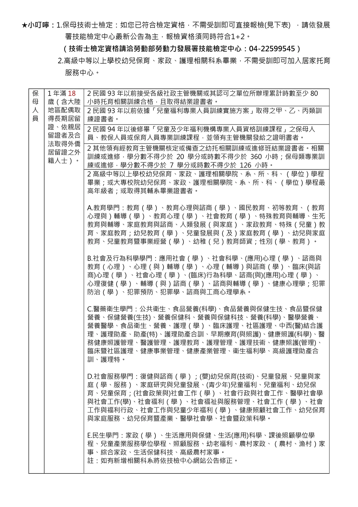 ★小叮嚀:1.保母技術士檢定:如您已符合檢定資格,不需受訓即可直接報檢(見下表) ,請依發展署技能檢定中心最新公告為主,報檢資格須同時符合1+2。