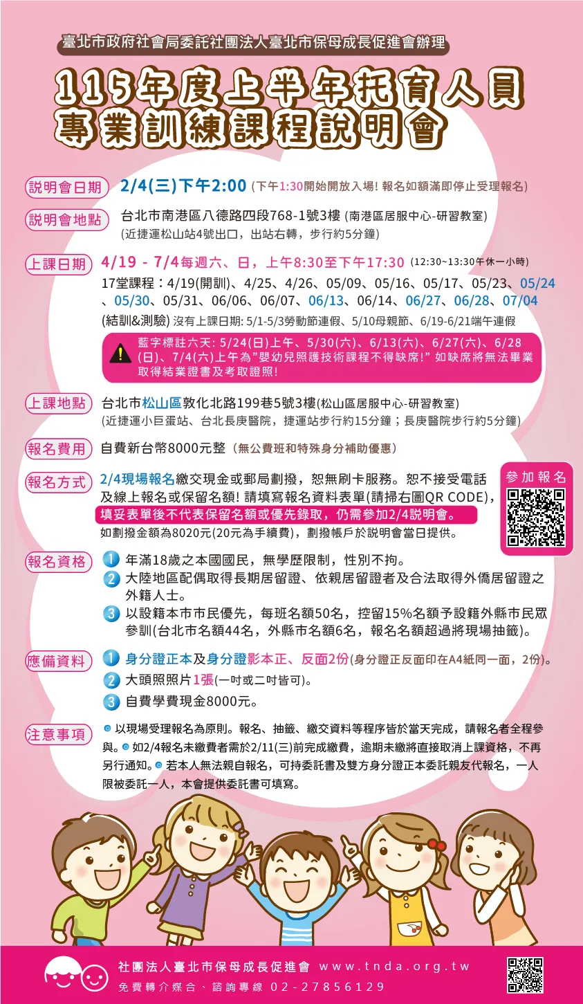 課程資訊👉115年度上半年臺北市托育人員(保母)專業訓練課程說明會